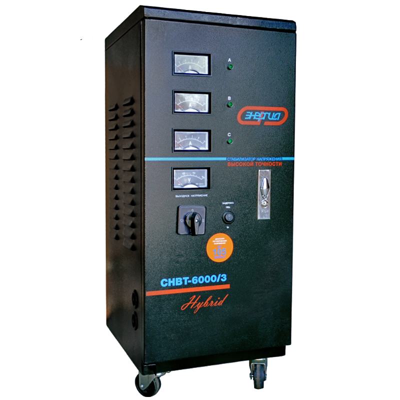 Компания Энергия выпускает трёхфазный стабилизатор напряжения 6000/3 серии HYBRID для защиты оборудования мощностью до 6000 ВА от некачественного напряжения. Трёхфазный аппарат состоит из трёх однофазных стабилизаторов мощностью 2000 ВА каждый, суммарная трёхфазная мощность равна 6000 ВА. Серия HYBRID совмещает два типа стабилизации: электромеханическую и электронную, что позволяет работать с очень низким напряжением (105 Вольт) или с очень высоким (280 Вольт).